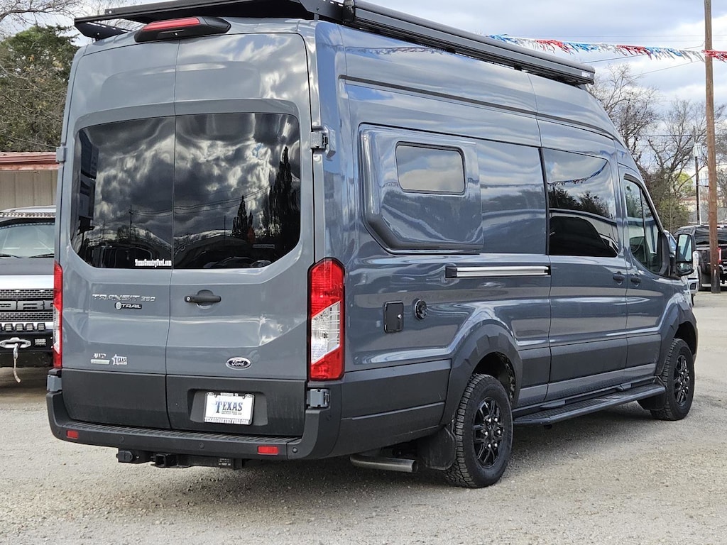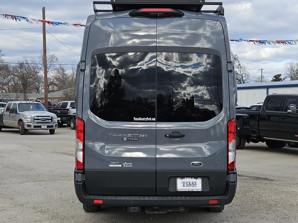- Includes 3.5 in. body lift with improved ground clearance, approach and departure angles, 71 in. front track width, 71.4 in. rear track width, 16 in. black alloy wheels with 245/75R16 all-terrain tires, slider style side steps, unique black Transit Trail grille with integrated marker lamps, unique Transit Trail badges, skid plate style front bumper, unique Transit Trail splash guards and wheel arch cladding, front wheel arch liners, dual AGM batteries, HID headlamps, front fog lamps, intelligent access with push-button start, keyless entry keypad, 4-way manual adjustable driver and passenger swivel seats, SYNC 4 with enhanced conversational voice recognition, 12 in. LCD capacitive touchscreen, SiriusXM with 360L, HD radio, connected navigation, Bluetooth, dual USB ports, automatic temperature control, high resolution digital camera, 110V/400W front power outlet, 12V cargo area power outlet, front overhead shelf, sun visors with illuminated vanity mirrors for driver and front passenger, B-pillar assist handle, fixed glass for rear cargo doors and rear passenger side door, rear cargo door window defogger, privacy glass, blind spot information system with cross traffic alert and trailer coverage, adaptive cruise control, reverse sensing system, side sensing system, dual note horn, auxiliary fuse box, frame mounted hitch receiver, 4-pin and 7-pin connector wiring, tow/haul mode, and relay system for backup/B+/running lights.